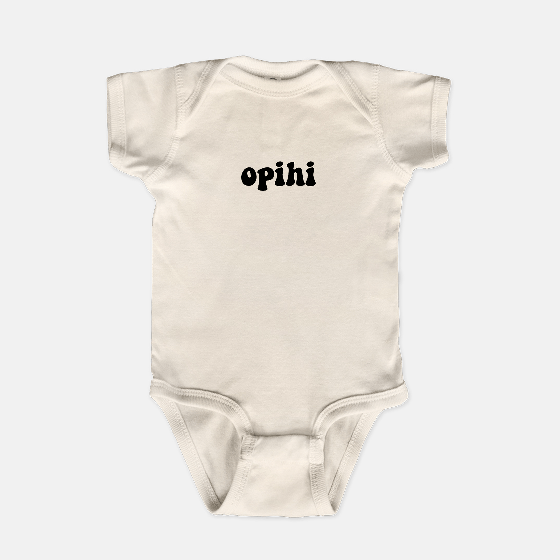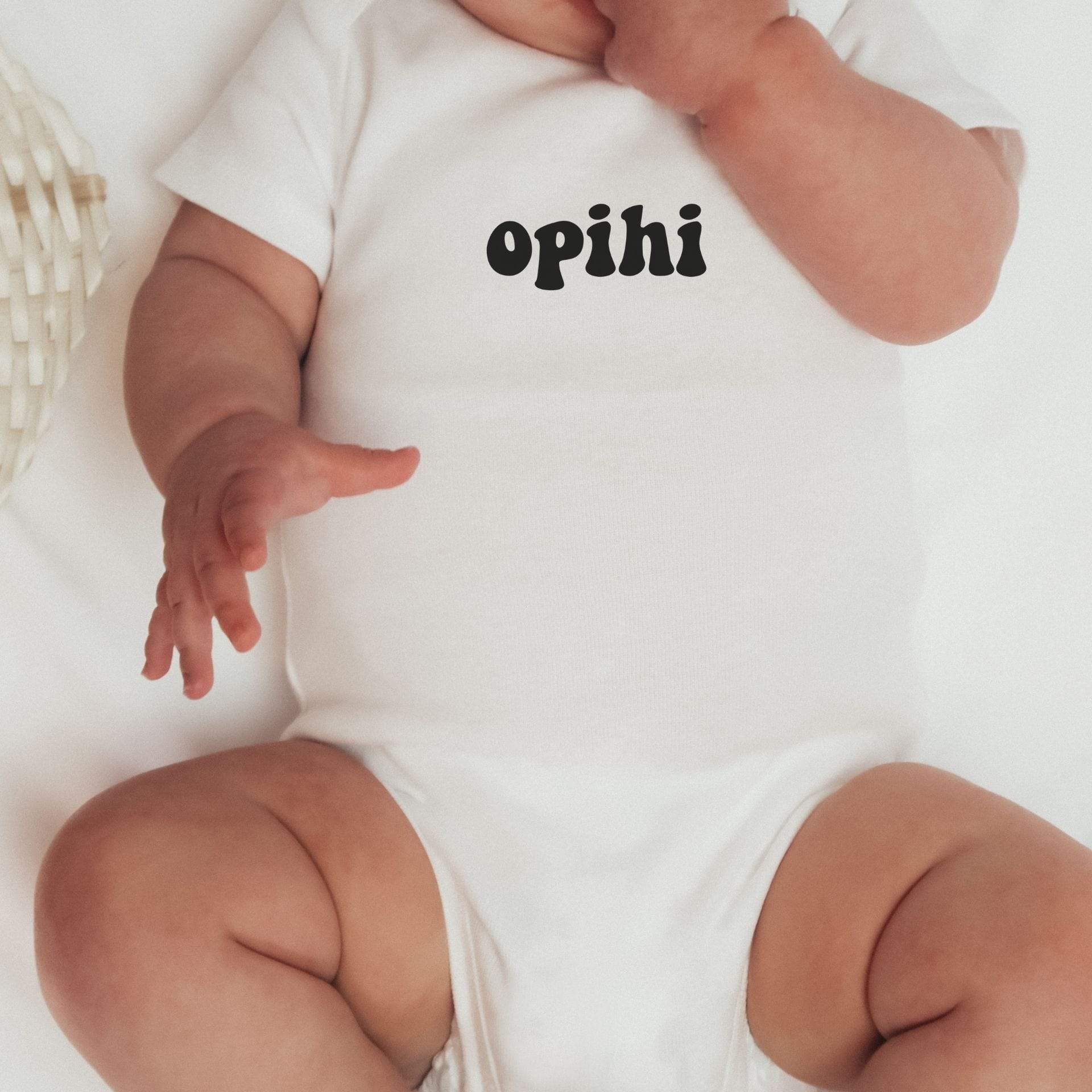 Opihi one piece for your sweet opihi baby. Our babes were such little opihis. Retro/vintage inspired font for all the vibes. (This font print is slightly larger than the rest of our nickname designs to accommodate visual aesthetics)