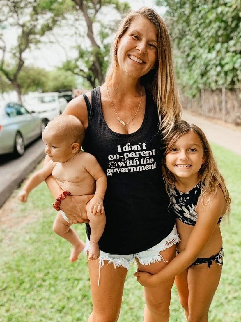 I don't co-parent with the government, do you? Our best selling tee is now available in black racerback tank tops! These are in stock and ready to ship!